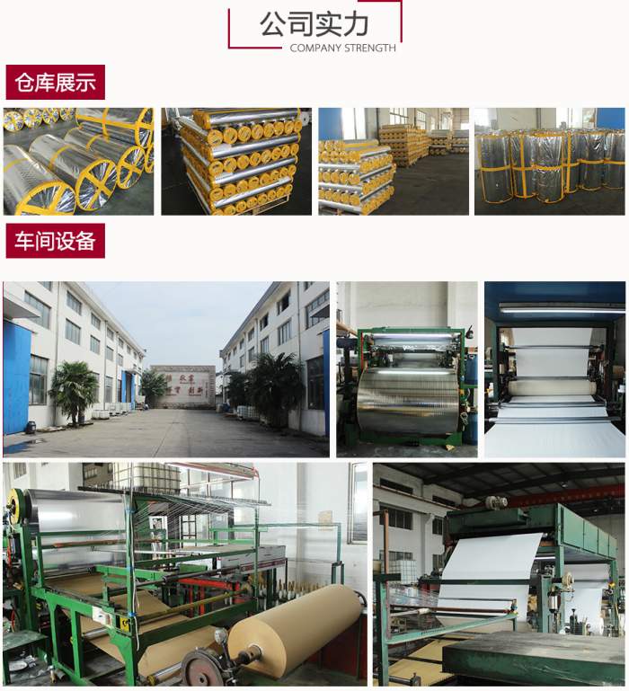 公司不斷引進國內外先進技術設備,供應各種保溫隔熱貼面,專業生產單、雙面夾筋鋁箔,各種規格鋁箔牛皮紙,鋁箔玻纖布,鋁箔網格布,鋁箔編織布,汽車隔熱墊用鋁箔,聚丙烯夾筋,白膜三合一,二合一,PVC白膜夾筋以及各類鍍鋁膜貼面。
